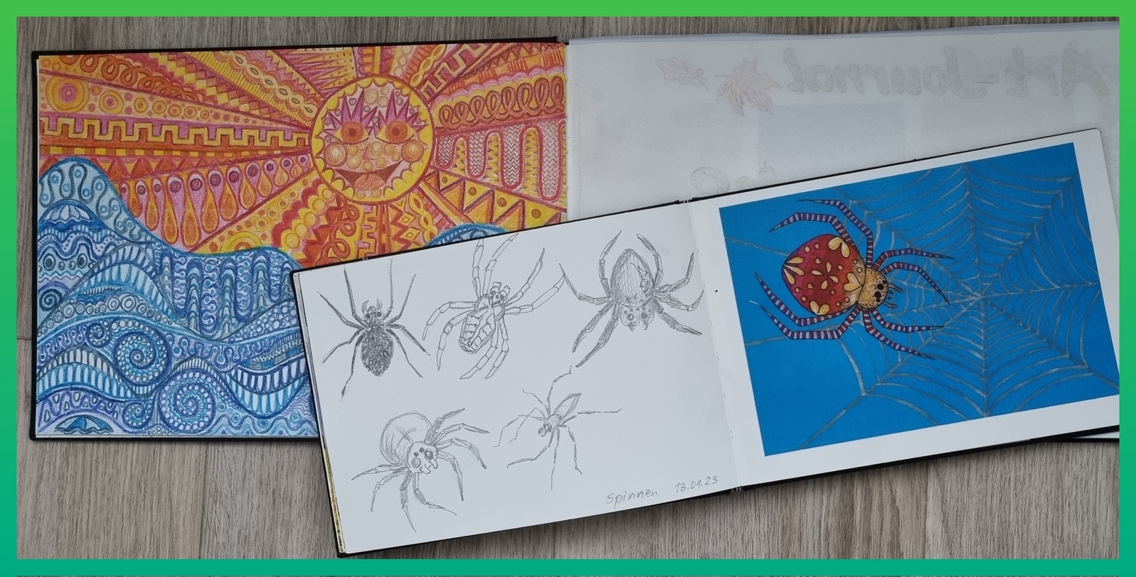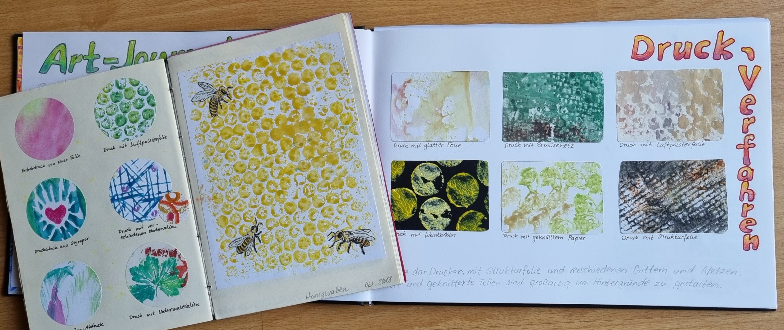 Spannend wird es, wenn man mit Farbkombinationen spielt, angetrocknete Drucke überdruckt und sich tatsächlich darauf einlässt herumzuexperimentieren. Hier heißt es: „Drucken, drucken, drucken!“